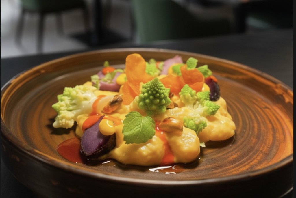Edamame and palm hearts on tiger milk, sweet potato, crispy plantain and red onion