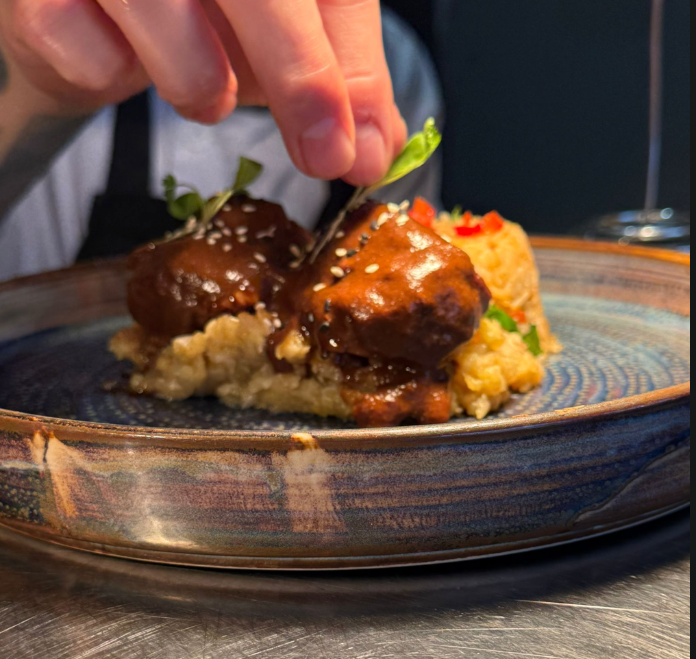 Slow cooked Pork cheeks, Plantain mash, Mexican style Mole, mix sesame seeds and steamed rice sofrito