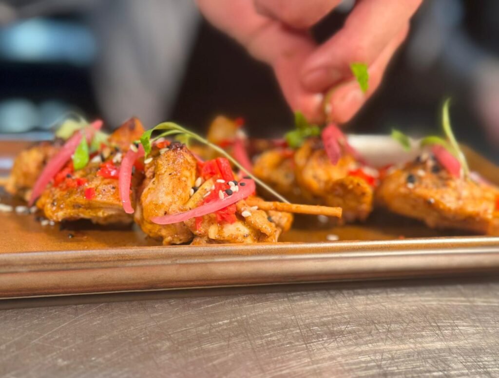 Nikkei style chicken skewers with spiced soy sauce, sesame and Scallions