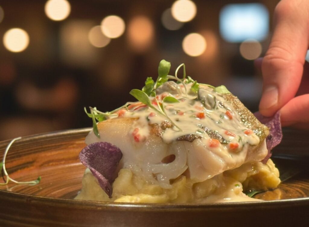 Coconut Cod Supreme cooked, banana leaf, crushed nori steamed cassava and chilli, coriander and capers sauce
